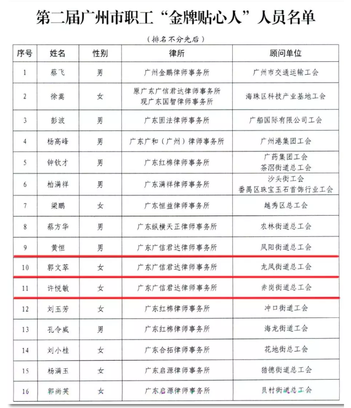 为进一步发挥广州市工会法律服务律师团队律师在维护社会和谐稳定中的作用,激发工会法律服务律师团队活力,广州市总工会开展了第二届广州市职工“金牌贴心人”推荐活动。近期,评选结果公布,其中,广东广信君达律师事务所合伙人许悦敏律师,黄恒律师、郭文萃律师荣获“金牌贴心人”称号。