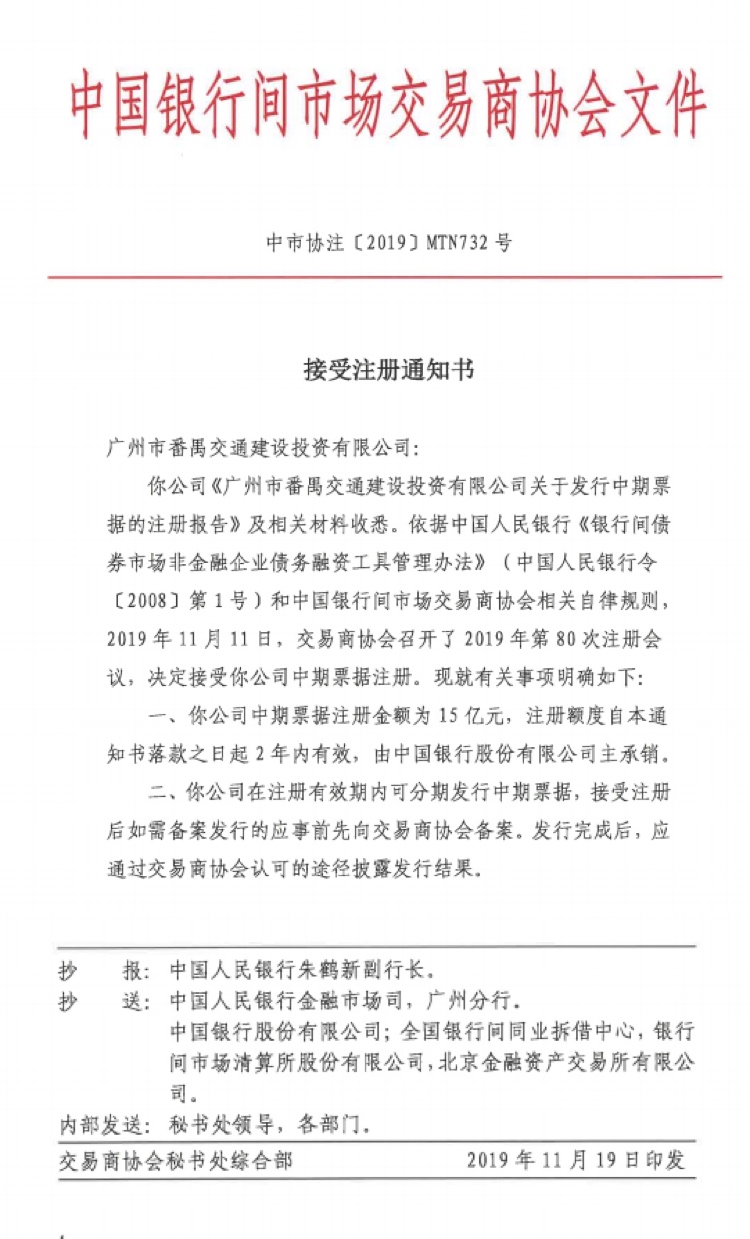 2019年11月19日,中国银行间市场交易商协会出具《接受注册通知书》(中市协注【2019】MTN732号),接受广州市番禺交通建设投资有限公司(以下简称“番禺交投”)中期票据注册,注册金额为15亿元,注册额度为本通知书落款之日起2年内有效,由中国银行股份有限公司主承销。